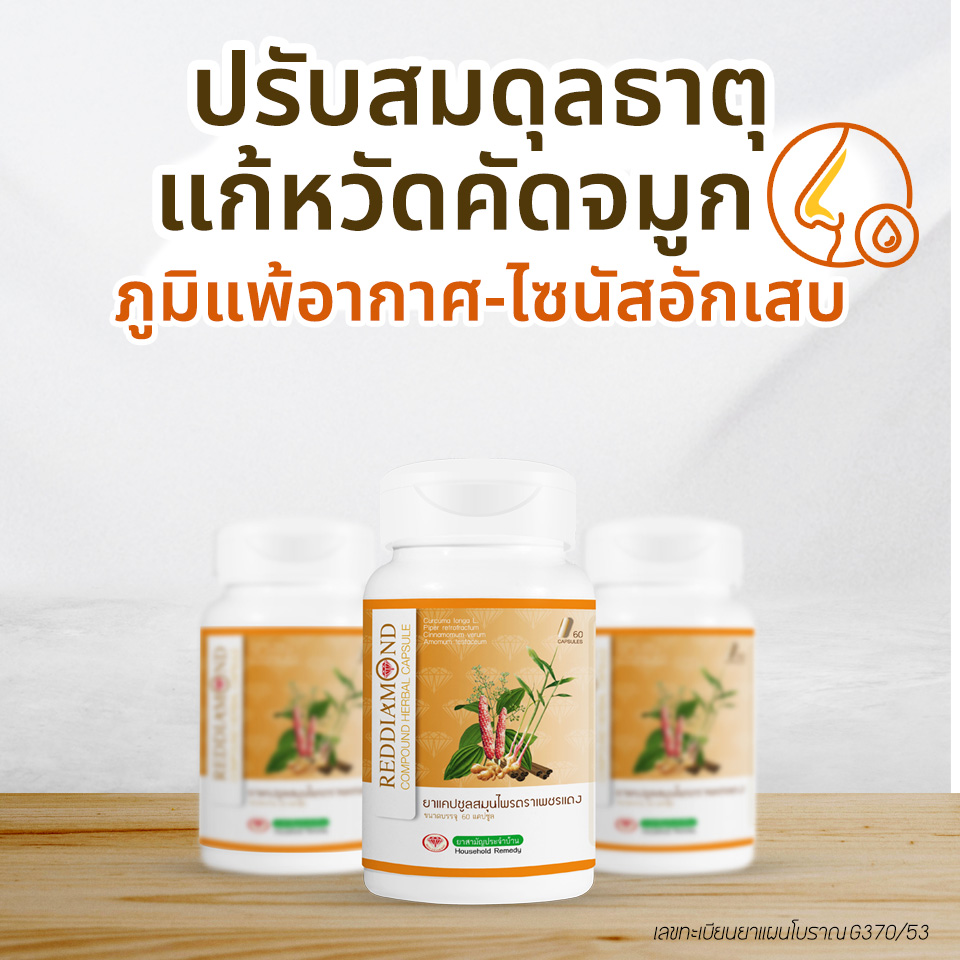 ตอบ: กฏหมายการขอขึ้นทะเบียนตำรับยาแผนโบราณ จะต้องระบุสรรพคุณการรักษาไว้ในตำรับคัมภีร์แพทย์แผนไทยเท่านั้น ไม่สามารถระบุสรรพคุณในการรักษาโรคได้ การเจ็บป่วยด้วยโรคภูมิแพ้ โรคระบบทางเดินหายใจ เกิดจากความผิดปกติของธาตุทั้ง 4 ในร่างกาย (ในทางวิทยาศาสตร์คือ ระบบภูมิคุ้มกันไม่แข็งแรง) ดังนั้นการรักษาโรคภูมิแพ้ อาการอักเสบของไซนัสด้วยยาแผนโบราณจึงใช้ยาเสริมภูมิต้านทาน ให้ยาปรับธาตุ บำรุงธาตุ บำรุงโลหิต ขับพิษในร่างกาย โดยสมุนไพรที่ใช้ในตำรับยาแคปซูลสมุนไพรตราเพชรแดง เป็นสมุนไพรฤทธิ์ร้อนซึ่งมีสรรพคุณในการขับลมด้วย
